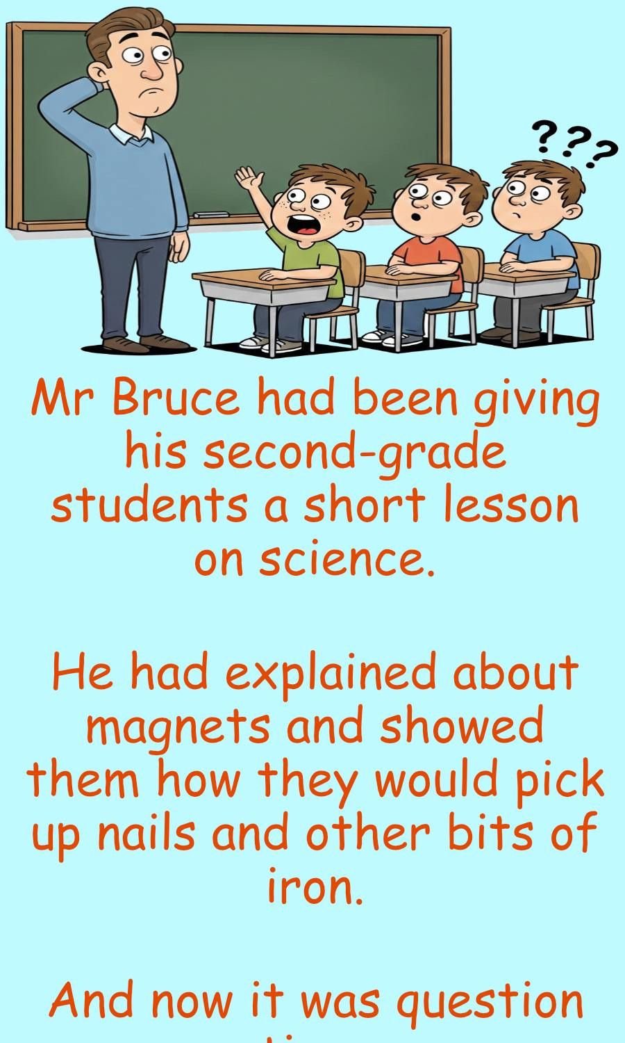 Mr Bruce had been giving his second-grade students a short lesson on science. He had explained about magnets and showed them how they would pick up nails and other bits of iron. And now it was question time. “Class,” he said. “My name begins with the letter ‘M’ and I pick up things. What am I?” … ... A little boy in the front row said: “You’re a mother”. ========================== Grandpa and grandma were watching the television evangelical show and the preacher said, if the viewers at home wanted to be healed, place one hand on the television set and…