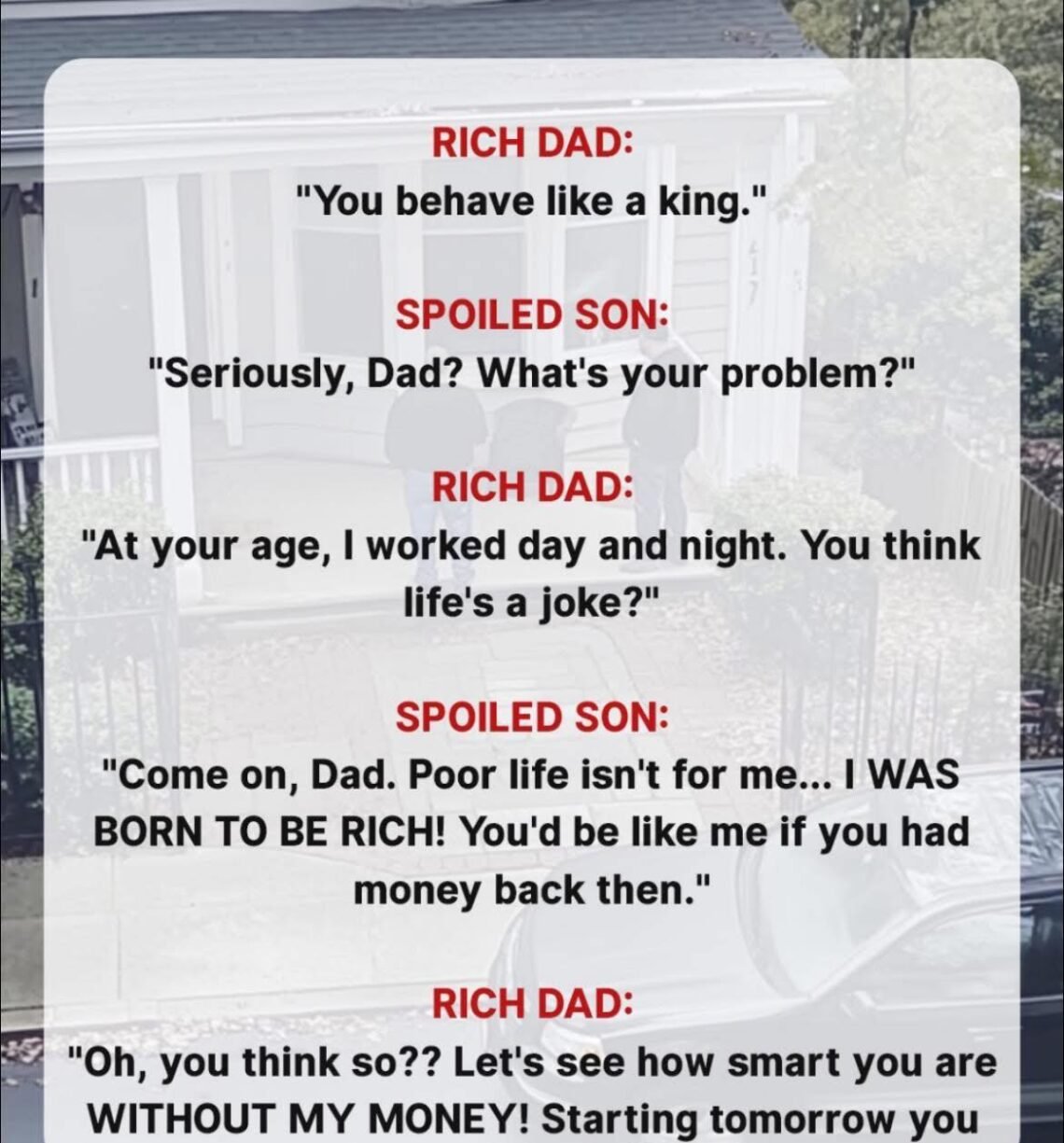 “Listen,” I said, trying to sound reasonable. “I get it. Hard work is important, money isn’t everything, blah blah. Just tell my dad I’ve changed so I can go home.”