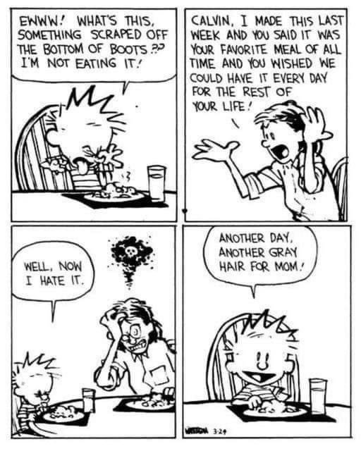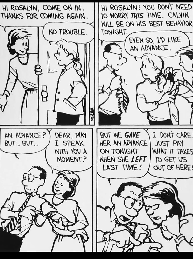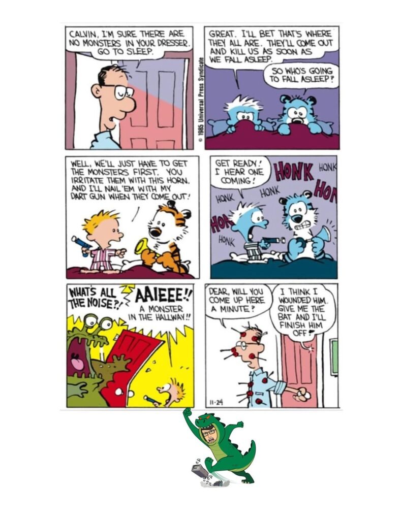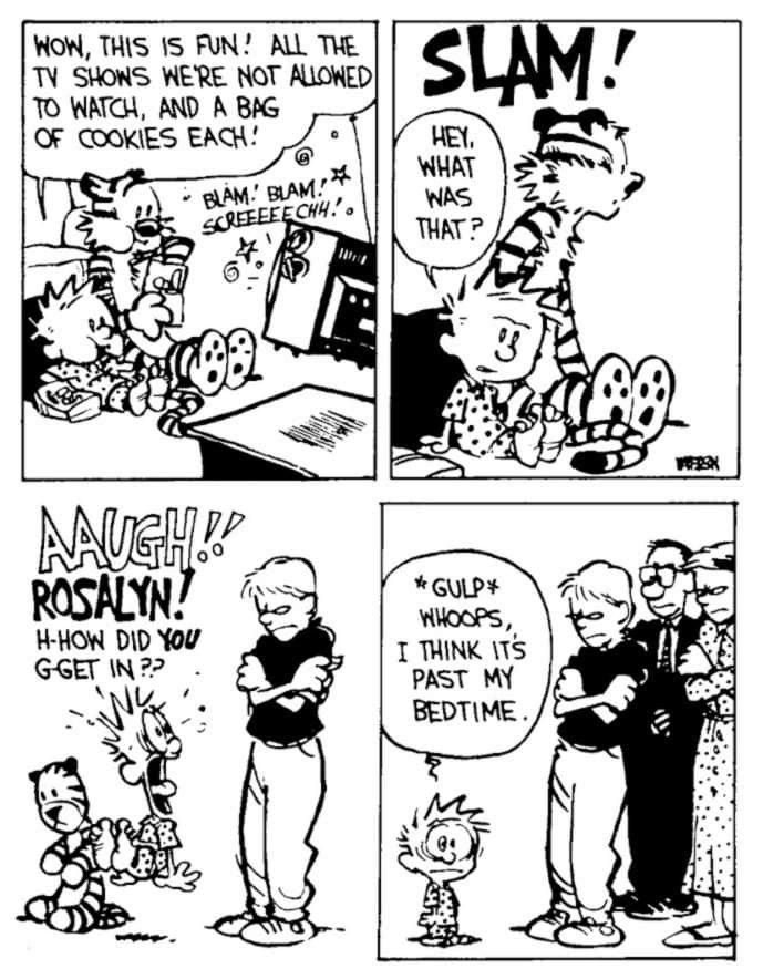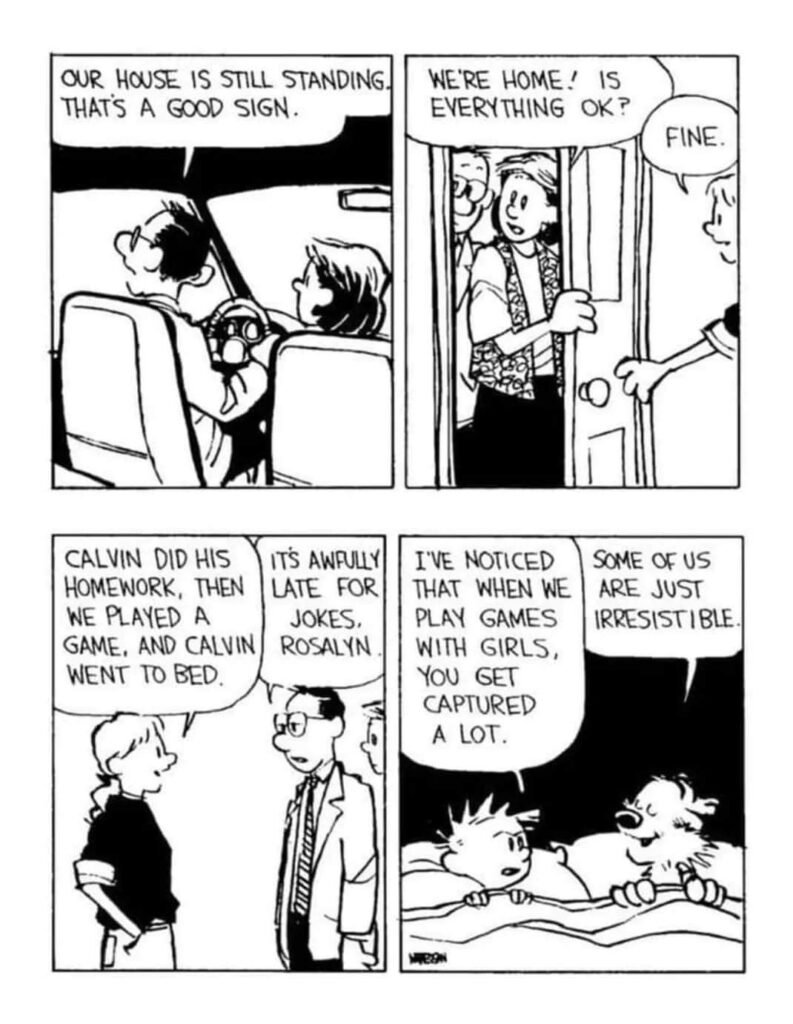 The humor comes from the brilliant contrast between Calvin’s epic, inner world and his mundane, outer reality. We see the giant, scaly monster, but his mom just sees her little boy making faces in the backyard. These scenarios are a perfect encapsulation of childhood—a time when your imagination was so powerful it could transform you completely. They gave us a good laugh Because they are so energetic and over-the-top, but they also remember us of that incredible feeling of being completely lost in a world of your own making