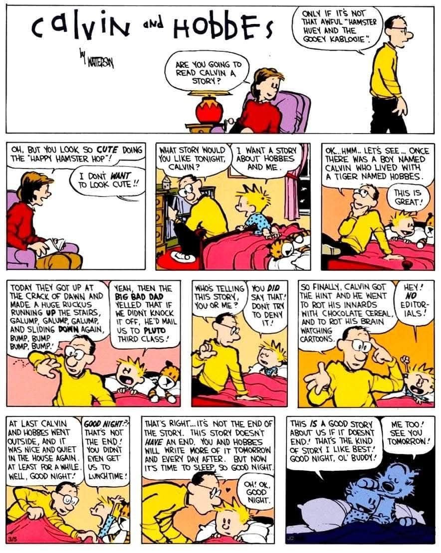 Calvin will pose a deep, existing question: “Why do we exist, Hobbes? What’s the meaning of life?” Hobbes, every the pragmatist, will reply with something like, “We exist to eat tuna sandwiches and take naps in the sun.” Or Calvin will lament the state of the world, and Hobbes will offer a simple, devastatingly funny, and surprisingly insightful perspective.
