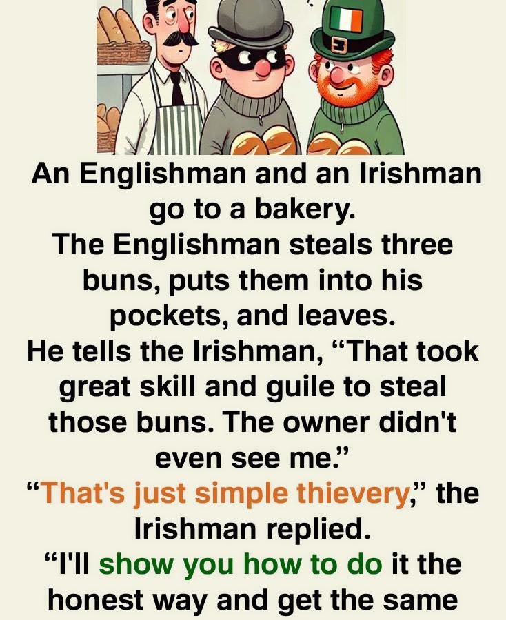 1st joke: The Englishman steals three buns, puts them into his pockets, and leaves. He tells the Irishman, “That took great skill and guile to steal those buns. The owner didn’t even see me.” “That’s just simple thievery,” the Irishman replied. “I’ll show you how to do it the honest way and get the same results.” The Irishman then proceeded to call out the owner of the bakery and said, “Sir, I want to show you a magic trick.” The owner was intrigued, so he came over to see the magic trick. The Irishman asked him for a bun, and…
