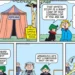 Flo saves tirelessly to afford a sunny holiday. The final panel reveals them on a beach—but it’s pouring rain. Andy, under a blanket, grinning from ear to ear, says, “I told you we should’ve gone to the pub.” It’s a perfect joke on Flo’s Sisyphean struggles for betterment and Andy’s unwavering belief that all life’s comforts can be found within staggering distance of his local.