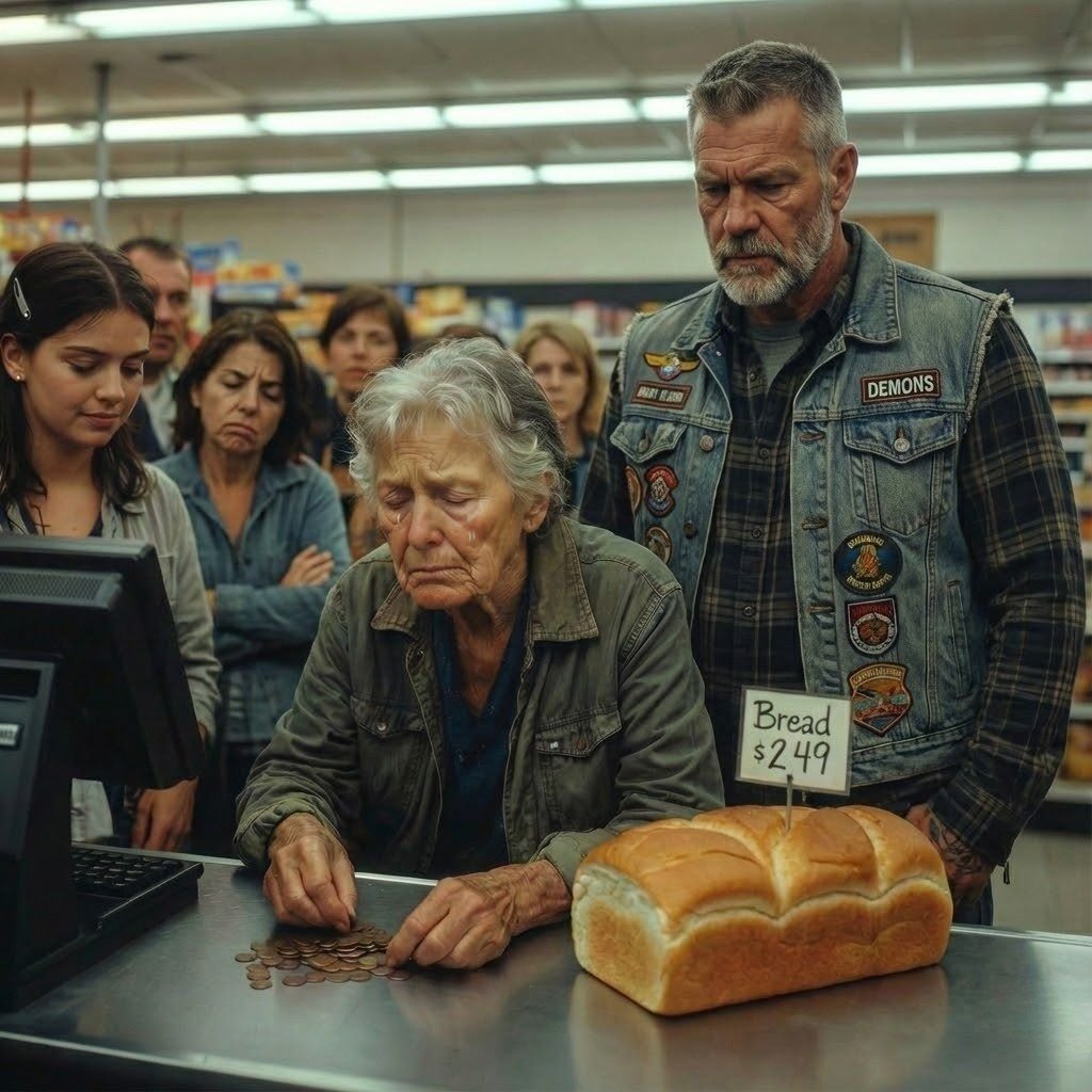 The cashier laughed at her — actually laughed — while that tiny old woman tried to count enough pennies for a loaf of bread. I’d spent sixty-seven years on this planet and forty-three on a bike, but I’d never felt rage hit me that fast. Her hands were shaking, her voice barely a whisper, and the people in line were sighing like she was nothing but an inconvenience. When the cashier mocked her for being twenty-three cents short, I slammed a twenty onto the counter and demanded she apologize. But everything shifted when the woman tugged at my sleeve and her arm revealed faded blue numbers. Auschwitz. A child survivor being humiliated in a grocery store over bread.